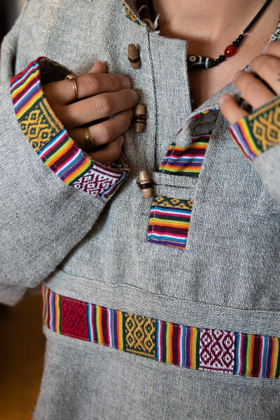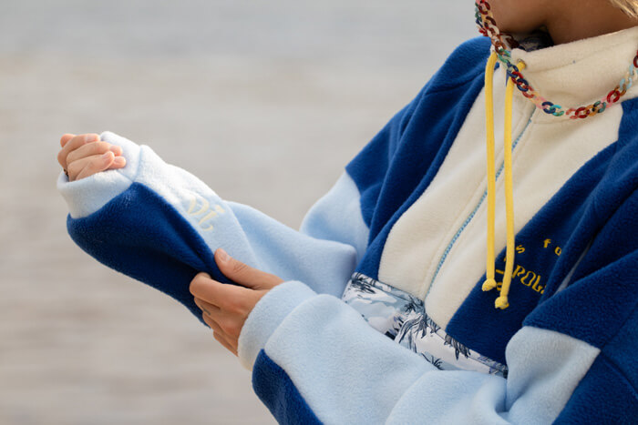 Seria powstaje z recyklingowanych materiałów, dzięki czemu każdy produkt jest unikalny i przyjazny dla planety. Szyjemy je w Polsce z tkanin, które zostały poddane recyklingowi a część dochodu wspiera młodych artystów.