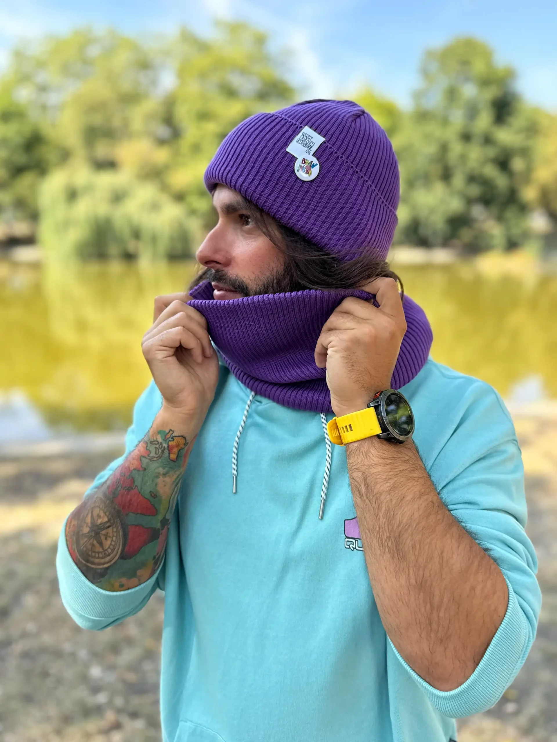 Miękka jak kocyk u babci, oddychająca jak Twoje ulubione sneakersy — beanie z bawełny to klasyk z twistem. A nawet z dwoma twistami, bo to model 2w1: możesz ją nosić podwiniętą (czapka beanie) albo rozwiniętą (smerfetka, luźna czapka). Po lewej stronie haftowane, dwustronne, kolorowe logo, więc każdy wie, że masz brain inside. A tuż obok – stajlowy pin, który dodaje charakteru i błysku jak wisienka na torcie (tylko bardziej streetwear). Idealna na chłodne poranki, złote zachody słońca i dni, gdy fryzura mówi „nie dzisiaj”. Elastyczna, lekka i niegryząca – nosisz i zapominasz, że ją masz (ale inni nie zapomną).